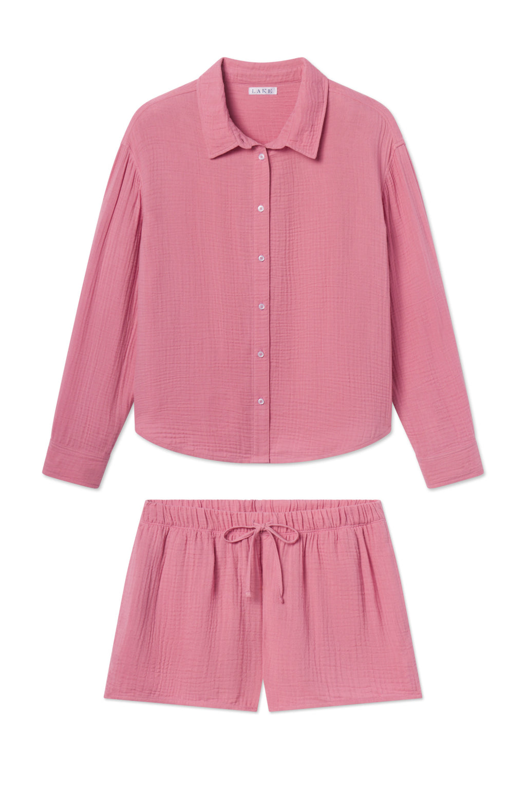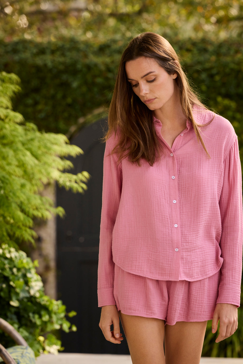 Designed in our lightweight Cotton Gauze, the Nantucket Shorts Set in Carnation, a soft pink, features a collared, long-sleeve button-down top with dropped shoulders and a relaxed fit for extra comfort. The shorts have pockets, a drawstring, and an elastic waistband. Made from 59% cotton and 41% modal.